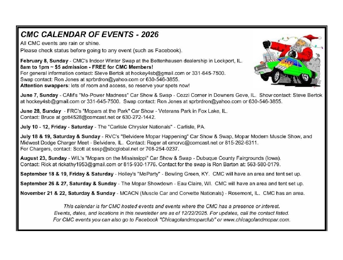 In January of 1990, a group of MOPAR enthusiasts formed the Chicagoland MOPAR Connection. Through the years chapters have been added to accommodate the growth of this dynamic car club. First there was the Rock Valley Chapter, next was the Mighty Mississippi Mopars Willowa Chapter, and then the Fox River Chapter. From the very early days there was always the membership that was called the Main Club, Today they are considered the CAM Chapter. Years later CMC has many hundreds of memberships and thousands that we consider members. A large portion of these members live in the greater metropolitan area of Chicago, IL. This geographical area includes Cook County, DuPage County, Will County, Kane County, Kendall County, Grundy County and northwestern Indiana. We have grown to include eastern Iowa and southern Wisconsin.