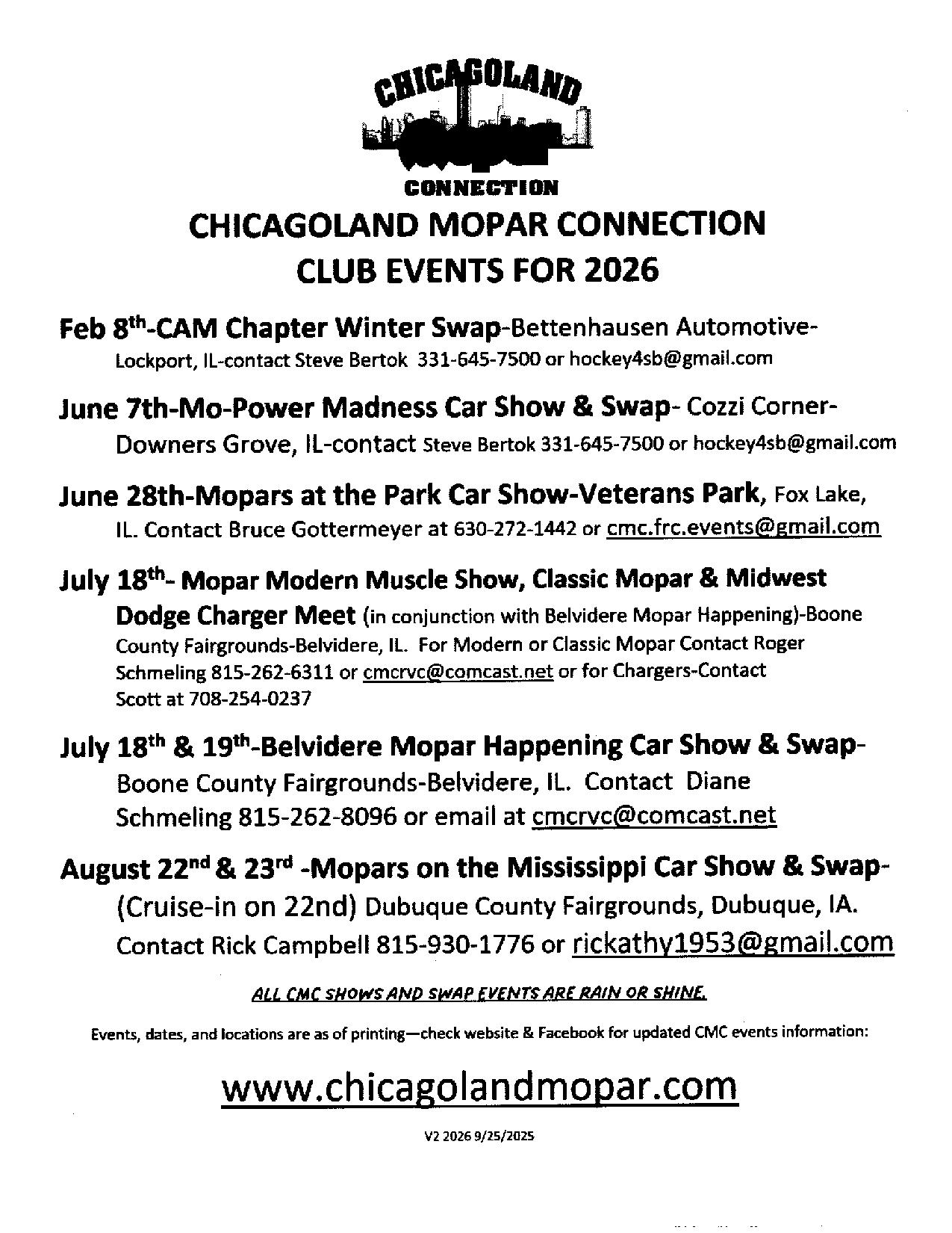 In January of 1990, a group of MOPAR enthusiasts formed the Chicagoland MOPAR Connection. Through the years chapters have been added to accommodate the growth of this dynamic car club. First there was the Rock Valley Chapter, next was the Mighty Mississippi Mopars Willowa Chapter, and then the Fox River Chapter. From the very early days there was always the membership that was called the Main Club, Today they are considered the CAM Chapter. Years later CMC has many hundreds of memberships and thousands that we consider members. A large portion of these members live in the greater metropolitan area of Chicago, IL. This geographical area includes Cook County, DuPage County, Will County, Kane County, Kendall County, Grundy County and northwestern Indiana. We have grown to include eastern Iowa and southern Wisconsin.